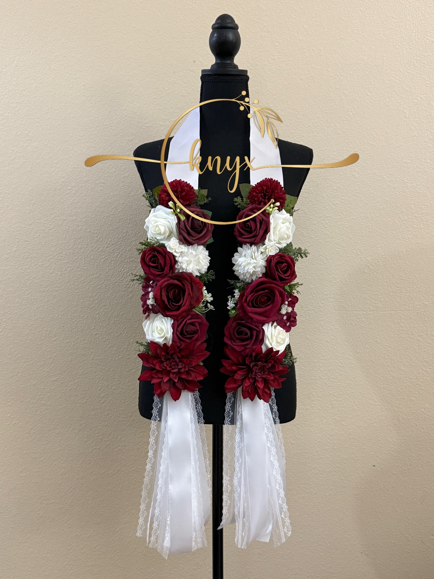 Our unique Graduation Flower Lei has long ribbon tail with blend of silk and foam flowers on a 2.5 inch double sided wired white ribbon that will last for a long time. This unique and gorgeous lei is more than a lei --it's a keepsake of your graduate's milestone moment.